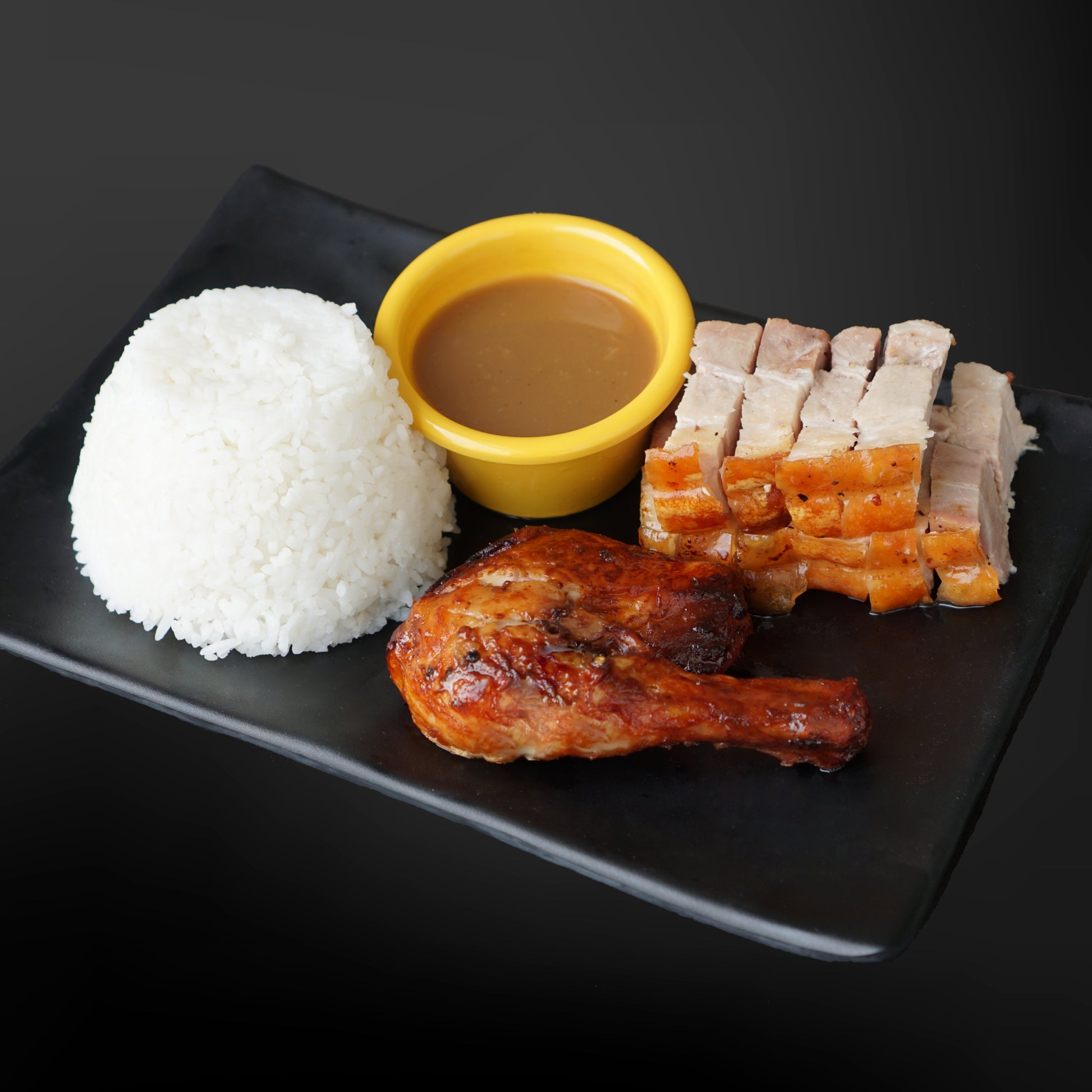 Combo Meal of 1-piece Roast Chicken, Litson Liempo slices, plain rice & gravy.