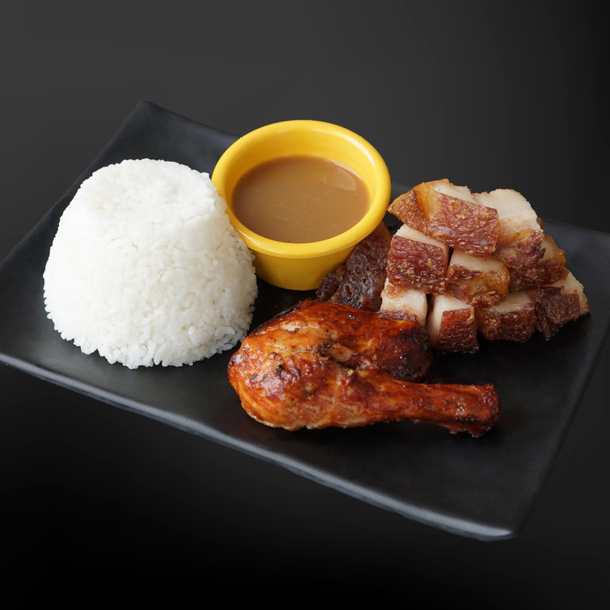Combo Meal of 1-piece Fried Chicken, Pritchon slices, plain rice & gravy.