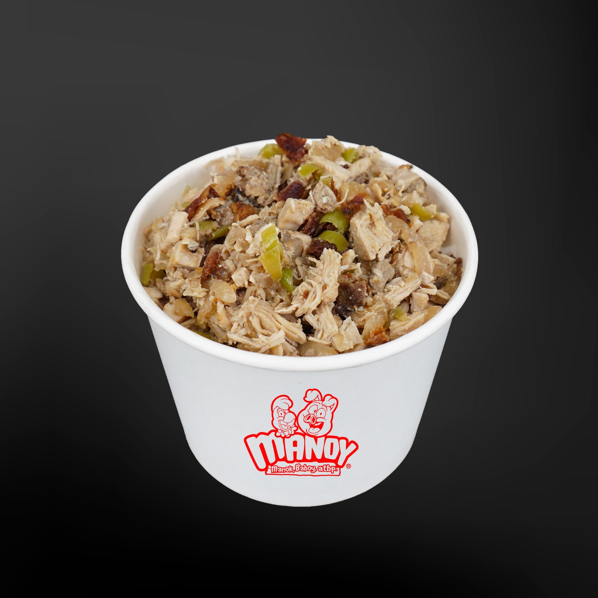 Freshly cooked chicken flakes in a special blend of tangy sisig flavors with a hint of spice. Served on top of plain rice.