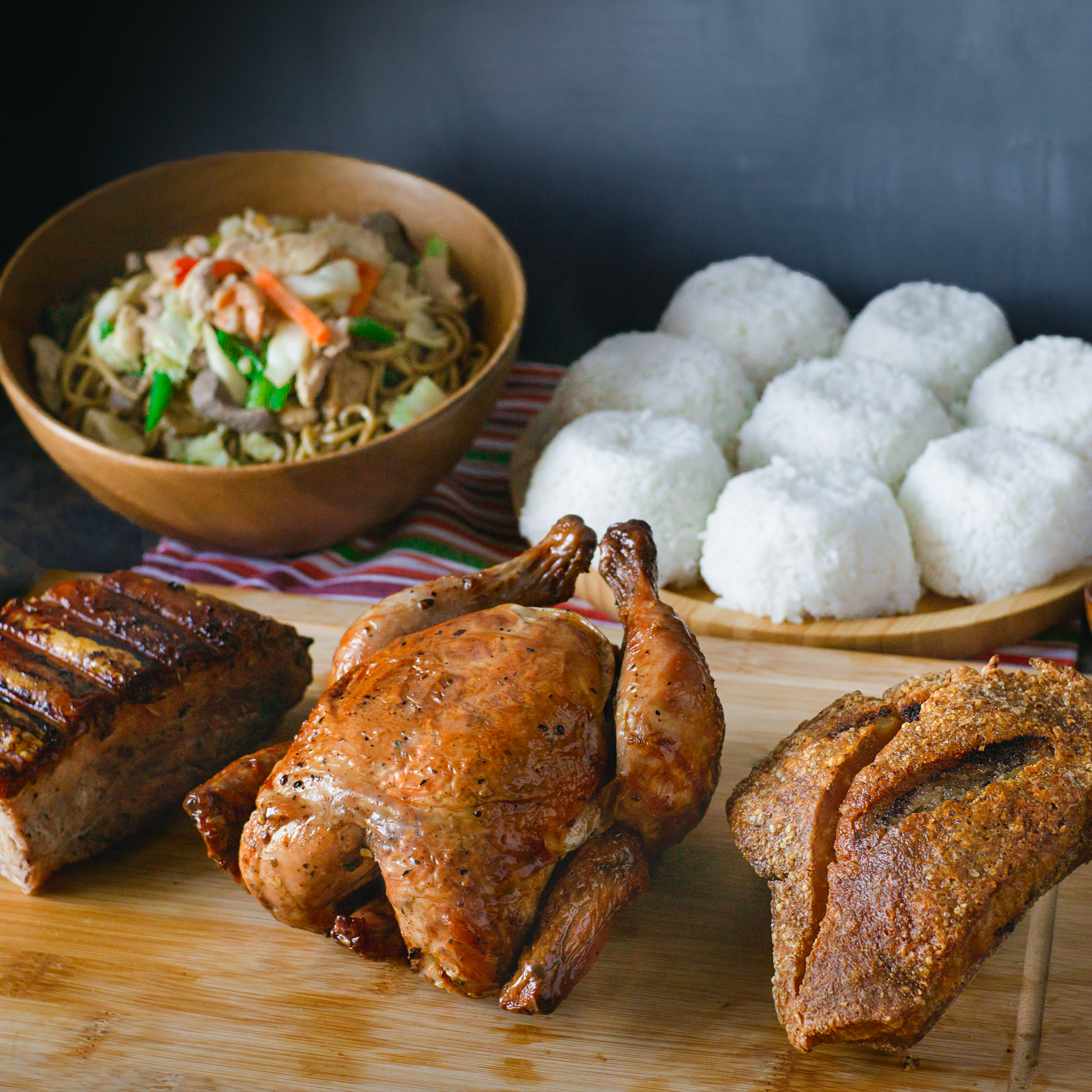 Set includes: 1 Whole Paborito Roasted Chicken, 1 Whole Litson Liempo, 1 Whole Pritchon, 8 servings Plain Rice, 6 servings Pancit Guisado (each serving is approx.180 grams). Recommended for 7-8 persons